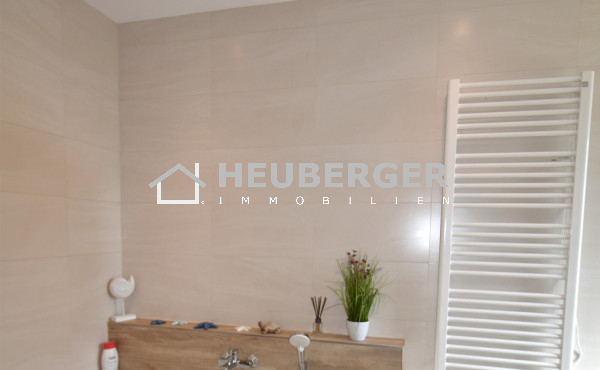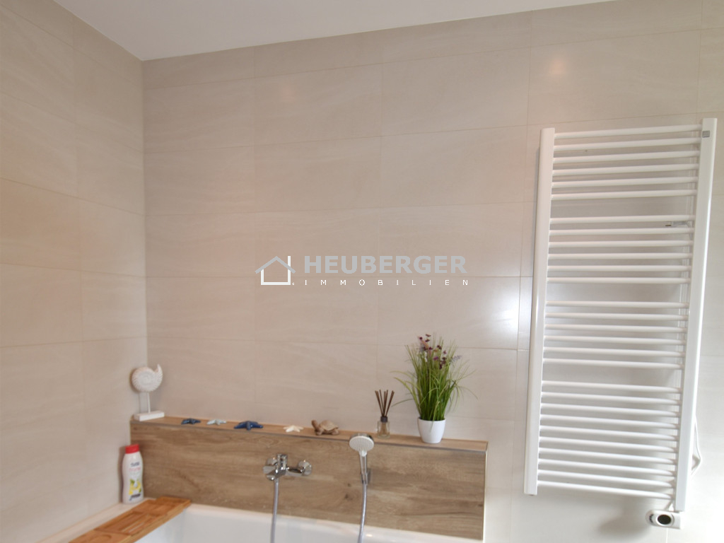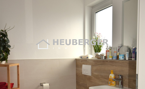 Tageslichtbad mit bodengleicher Dusche, Badewanne, Waschtisch und WC mit integrierter Bidetfunktion