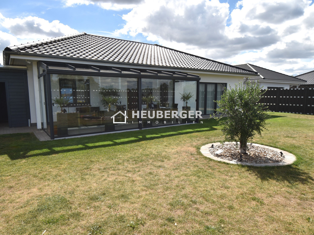 Einfach einziehen und wohlfühlen! Dieser moderne Bungalow mit komplett fertig angelegten Außenanlagen lässt keine Wünsche offen. Die gesamte Wohnfläche ist durchgehend mit einer hochwertigen Fliese ausgelegt und alle Wände sind weiß gestrichen. Für ein gutes Raumklima sorgen neben der über eine Wärmepumpe betriebenen Fußbodenheizung eine Lüftungsanlage sowie zwei Klimageräte im Wohn- und Schlafzimmer. Das schicke Badezimmer besticht mit einer großzügigen bodengleichen Dusche und tief eingelassenen Badewanne. Die offene Küche ist bei Bedarf durch eine große Glasschiebetür vom Wohnzimmer trennbar. Den Wintergarten kann man sowohl von der Küche als auch vom Wohnzimmer betreten. Hier kann man alle Glaselemente je nach Wunsch öffnen. Das Grundstück ist vollständig eingezäunt. Neben dem Haus befindet sich ein Carport, an welches sich ein Abstellraum mit Bewässerungsanlage für den Garten anschließt. Die Außenanlagen sind geschmackvoll gestaltet und unterstreichen das gepflegte Erscheinungsbild dieses Traumobjekts.