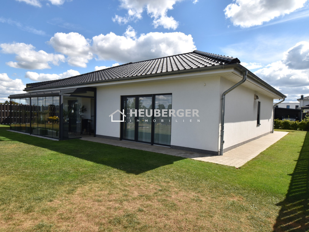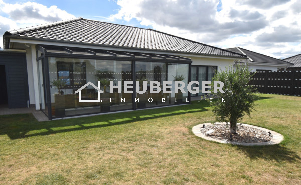Einfach einziehen und wohlfühlen! Dieser moderne Bungalow mit komplett fertig angelegten Außenanlagen lässt keine Wünsche offen. Die gesamte Wohnfläche ist durchgehend mit einer hochwertigen Fliese ausgelegt und alle Wände sind weiß gestrichen. Für ein gutes Raumklima sorgen neben der über eine Wärmepumpe betriebenen Fußbodenheizung eine Lüftungsanlage sowie zwei Klimageräte im Wohn- und Schlafzimmer. Das schicke Badezimmer besticht mit einer großzügigen bodengleichen Dusche und tief eingelassenen Badewanne. Die offene Küche ist bei Bedarf durch eine große Glasschiebetür vom Wohnzimmer trennbar. Den Wintergarten kann man sowohl von der Küche als auch vom Wohnzimmer betreten. Hier kann man alle Glaselemente je nach Wunsch öffnen. Das Grundstück ist vollständig eingezäunt. Neben dem Haus befindet sich ein Carport, an welches sich ein Abstellraum mit Bewässerungsanlage für den Garten anschließt. Die Außenanlagen sind geschmackvoll gestaltet und unterstreichen das gepflegte Erscheinungsbild dieses Traumobjekts.
