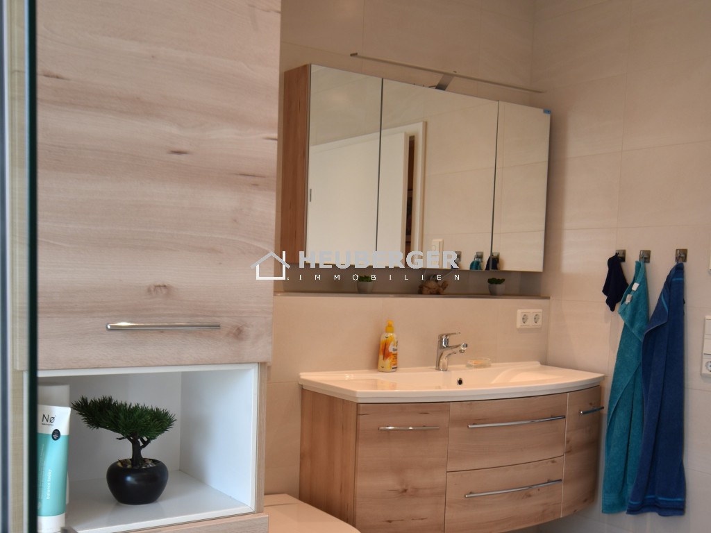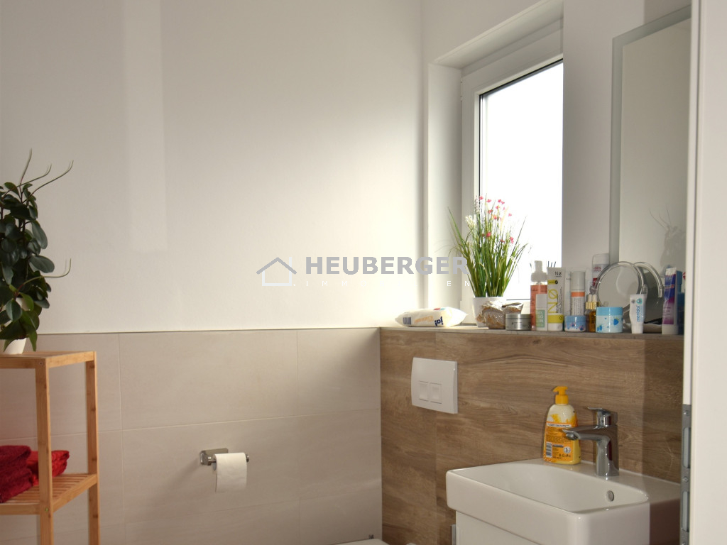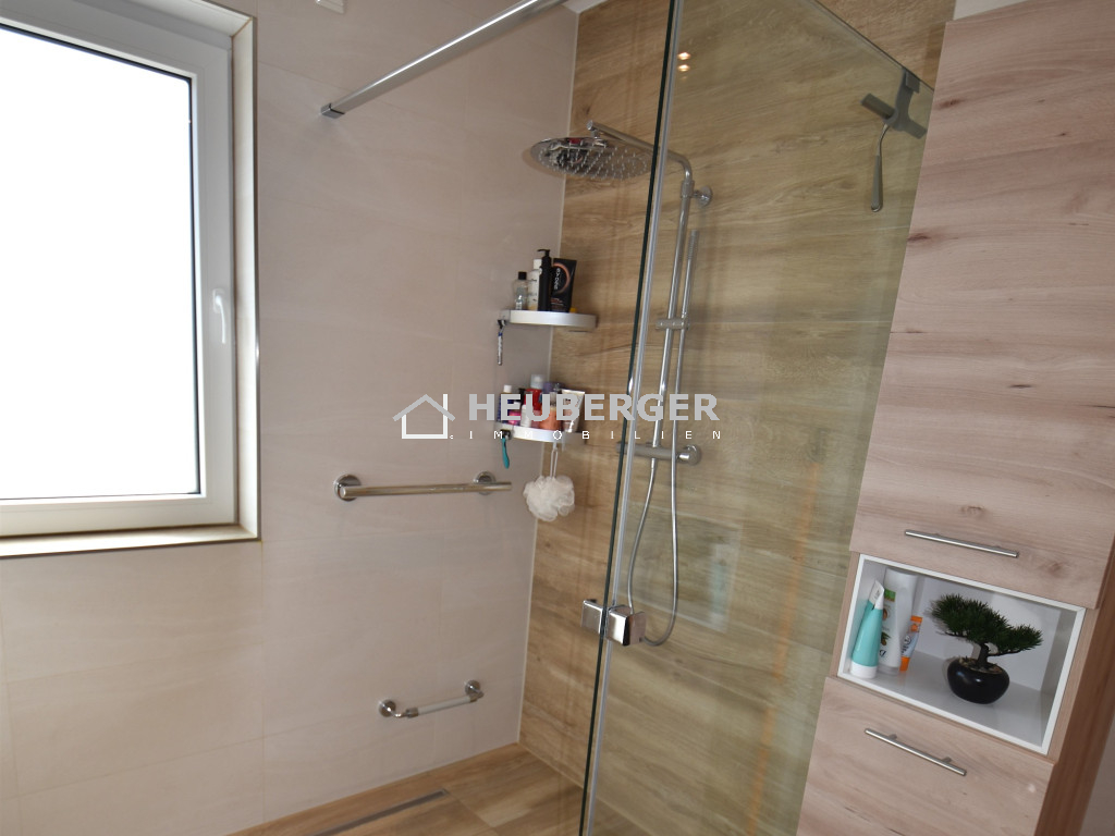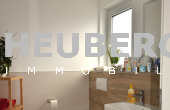 Tageslichtbad mit bodengleicher Dusche, Badewanne, Waschtisch und WC mit integrierter Bidetfunktion